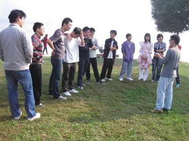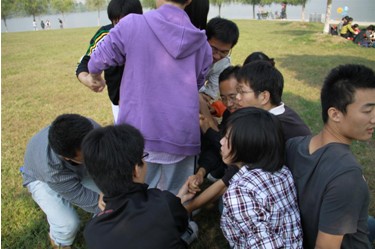 在“心有千千结”中,每个队手牵手围成一个圈,为进一步加强团队合作意识,要求将已打乱的左右手的队友重新找到并连起来,将形成的结解开。大家相互合作,开动脑筋,互相鼓励,最后大家通力合作将结顺利解开,并且领悟到,只要有心,没有什么心结是解不开的。
