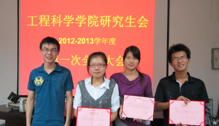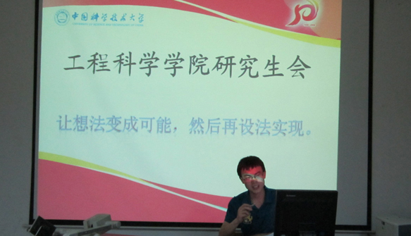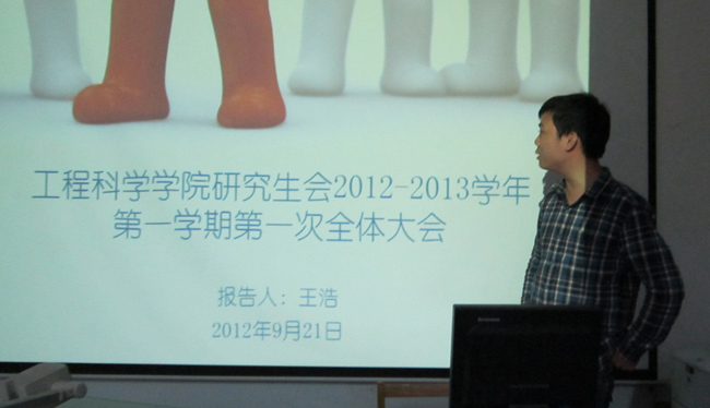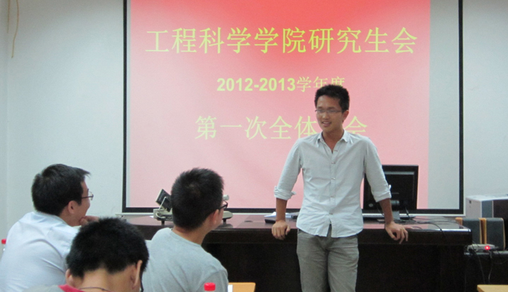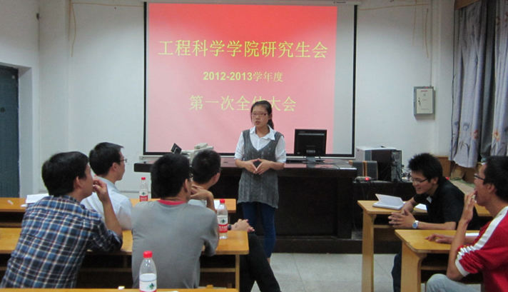 2012年9月21日晚上7点,工程科学学院研究生会在力二楼215多媒体教室举行了2012-2013学年度第一次全体大会。校研究生会副主席、院团委副书记朱伟经,历届院研会主席毛世鑫、郭琦作为嘉宾莅临指导。