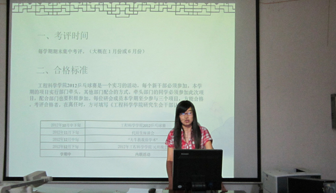 研会的秋季招新吸纳了新血液,组织在日益壮大。为了使新干部能够迅速的融入集体,大家每人首先进行了1分钟的简短自我介绍,在老干部的带动下,研会的气氛推向了高潮。随后,副主席王浩总结上一学年活动开展情况,并总结了自己一年来开展研会工作的心得体会。接着,主席朱云龙介绍了新学年研究生会的工作计划,积极鼓励新成员能够踊跃报名接下来的研会工作,希望新成员能够在项目的锻炼中不断成长。随后,副主席邸越就工程科学学院研究生会的规章制度做了介绍,让新成员对院研会的构成和制度有了更深层次地了解。院团委副书记朱伟经致辞,表达了对研会新干部加入新团体的祝福,并表达了对研会未来稳步发展的良好祝愿。接着,主席朱云龙对一年来为研会的发展和进步作出突出贡献的干部颁发荣誉证书,并做了精彩的激励演讲。
