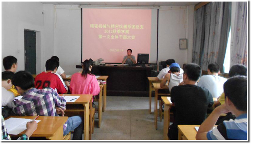 9月18日12:30,精密机械与精密仪器系团总支2012-2013年度第一学期第一次工作会议在力二楼215多媒体教室顺利开展。本次大会由九系团总支各常委,九系各班班长、团支书参加,由团总支常务副书记徐士海主持。