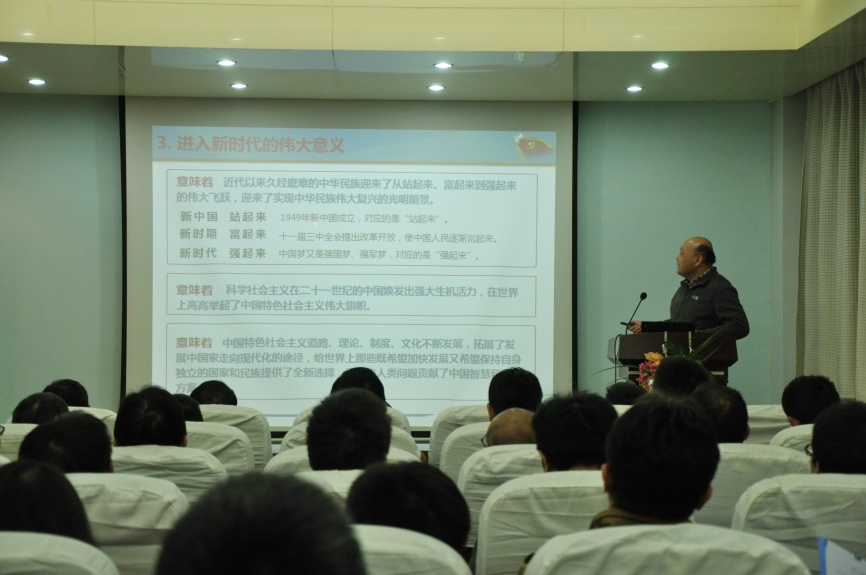 陆夕云带领大家回顾了党自十八大以来所取得的成就,阐述了新时代的五大特点,讲述了近代以来中国社会主要矛盾的演变,并结合十九大报告指出的社会主要矛盾的变化,分析了“新矛盾”论断的内涵以及“新矛盾”论断的重大意义。在讲述新思想时,他引用习近平总书记的一句“时代是思想之母,实践是理论之源”作为序言,深入浅出的回答了“新时代坚持和发展什么样的中国特色社会主义”“怎样坚持和发展中国特色社会主义”这两个问题。他指出,“八个明确”概括了新思想主要内容,“十四个坚持”描绘了新思想的基本方略,这两者相辅相成。前者从理论上回答了我们要坚持和发展的是什么样的社会主义,回答“是什么”的问题;后者则从实践层面明确回答了“怎么办”的问题。