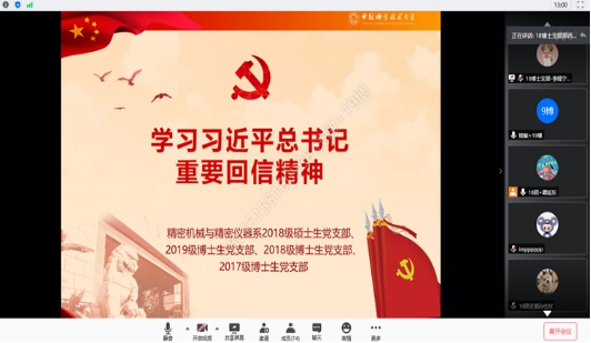 6月19号晚,必威betway西汉姆网页版 精密机械与精密仪器系硕博党支部联合召开线上学习座谈会,学习贯彻习近平总书记给科技工作者重要回信精神与习近平总书记给北京科技大学全体巴基斯坦留学生重要回信精神。17级博士党支部、18级博士党支部、19级博士党支部以及18级硕士党支部全体党员参加座谈会。