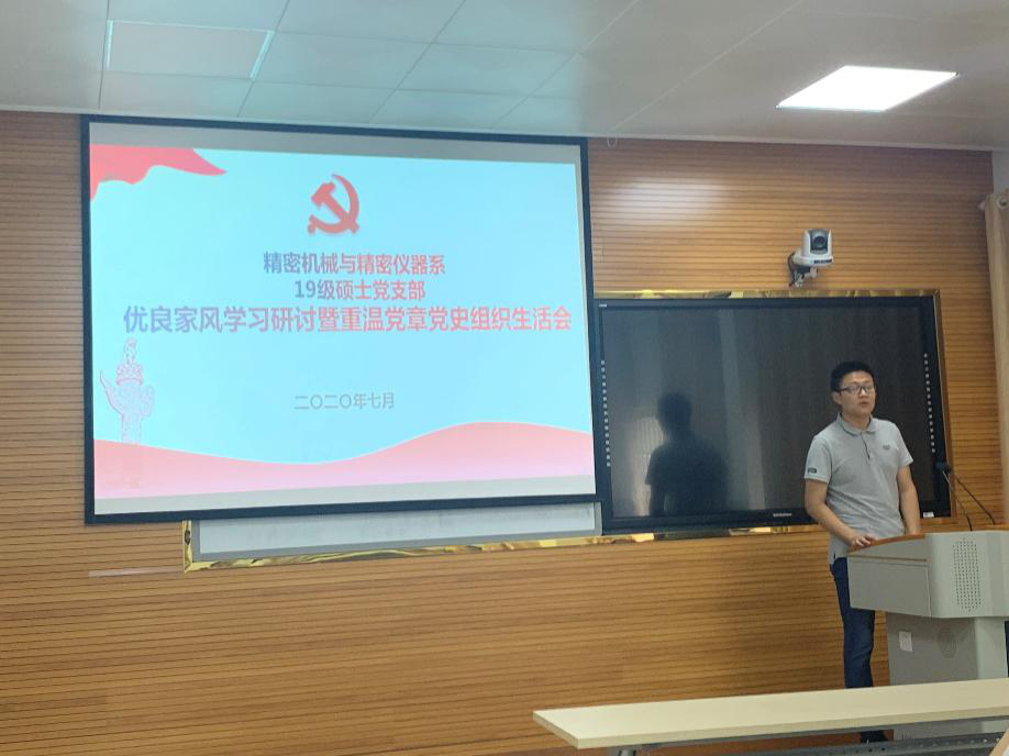 7月9日下午,精密机械与精密仪器系2019级硕士党支部在力学二楼215会议室召开了“优秀家风学习研讨暨重温党章党史”组织生活会。工程科学学院党委书记刘明侯出席本次会议,党支部正式党员和部分入党积极分子参与会议。此次会议由党支部书记周翔同志主持,内容主要分为视频学习、心得交流分享和会议总结三个部分。