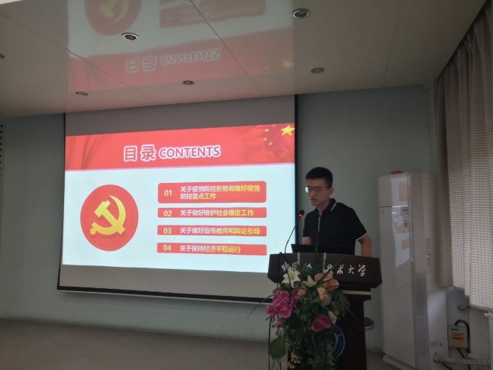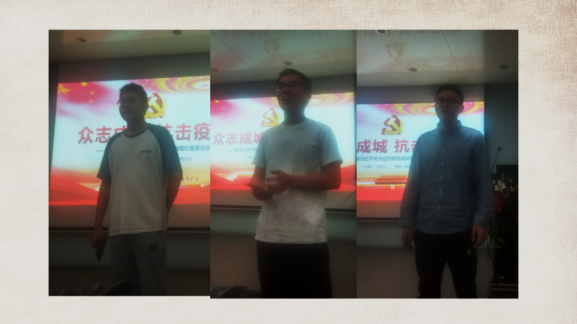 在认真学习习近平总书记的讲话后,全体与会党员进行了热烈的小组讨论,并由各小组代表做了总结发言。第一小组聂宝平同学表示:疫情虽然在一定程度上对生产生活产生了负面影响,但同时也要保持乐观,在疫情中抓住新机遇。第二小组王杰通过对国内外抗击疫情的比较,认为中国在抗击疫情的胜利充分体现了中国共产党的优越性和中国政府的强大执政能力。第三小组张帅帅指出了科学技术对于抗击疫情的重要作用,同时提出在疫情常态化的阶段要更加积极乐观。第四小组郭旭同学提醒大家要时刻不放松的防范境外输入病例,并且每个同学都要加强体育锻炼,以提高自身免疫能力。