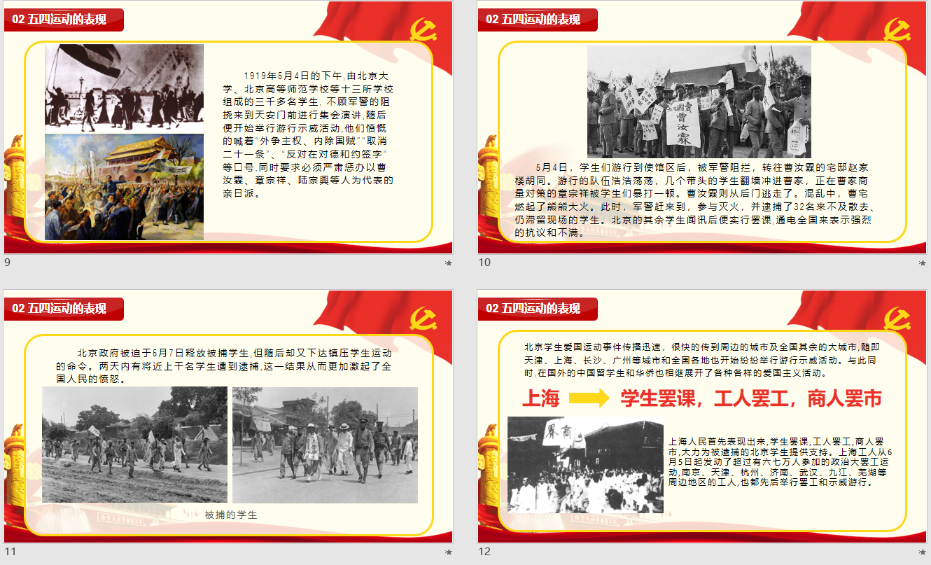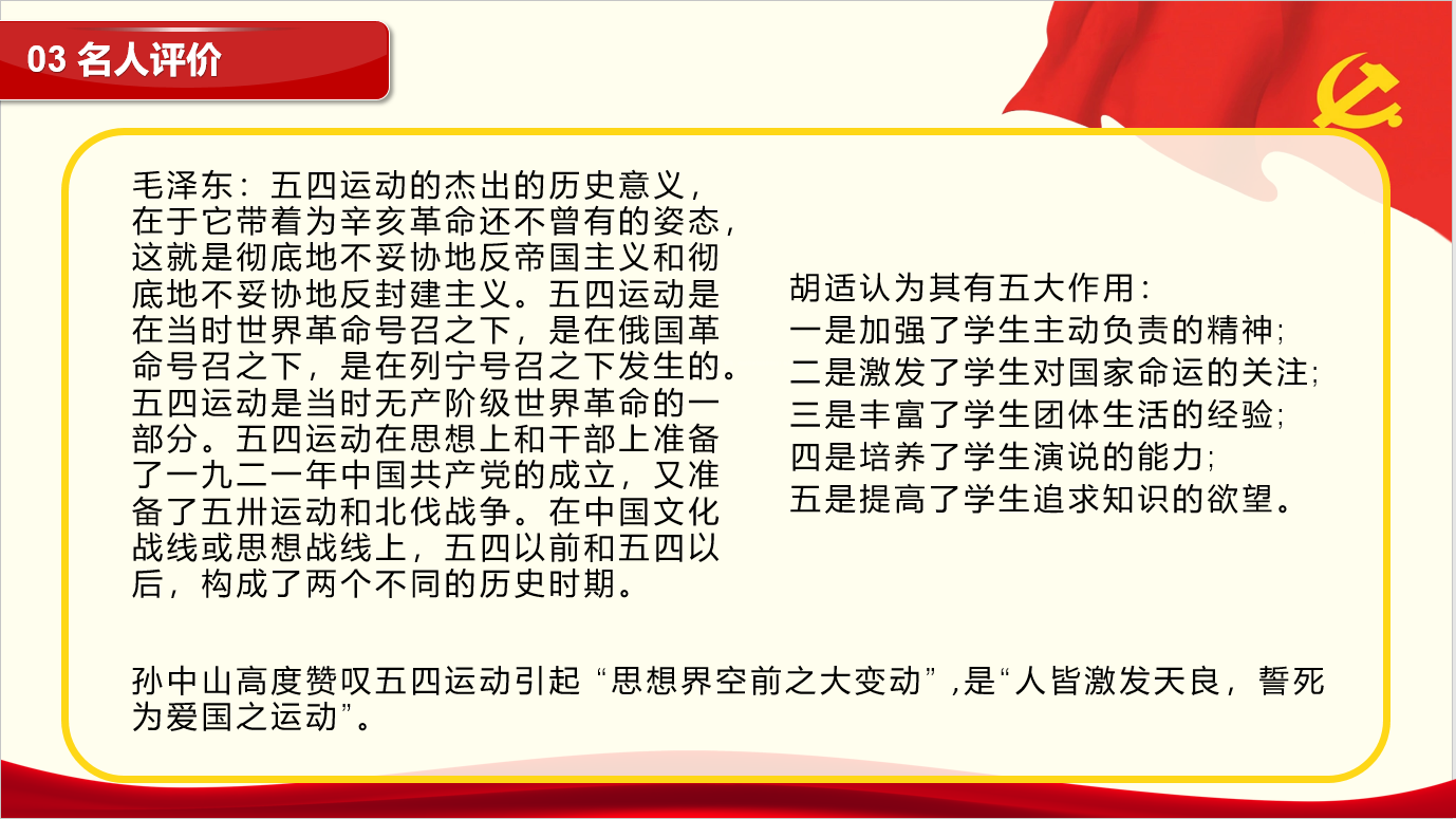 首先,主持人王梓齐带领大家回顾了五四运动的爆发背景、过程和历史意义。五四运动爆发于1919年5月4日,是一场以青年学生为主要参与对象的学生运动,是中国人民彻底反对帝国主义、封建主义的爱国运动。从此以后,中国革命便进入了一个新的历史发展阶段。因此,五四运动成为了中国新民主主义革命的开端,它也直接影响了中国共产党的诞生与发展。它同时又是一场影响深远的文化运动和思想解放运动:它把马克思主义引入中国,并使之与工人运动相结合,把当时的社会环境推向了以传播马克思主义为主流思潮的新的历史阶段,同时也开创了中外文化交流的新阶段。在汇报的最后,王梓齐分享了五四运动的新时代精神,他认为:尽管经过了一百多年的历史流逝,五四运动的丰富底蕴及深刻影响并未因此而枯萎,时间证明,这场运动凝集了近代中国的思想变革,它的伟大精神不仅能启发过去那个时代,而且还能照亮伟大的新时代。