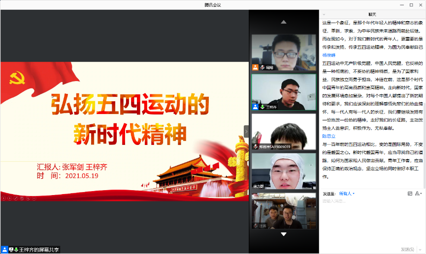 2021年5月19日下午,精密机械与精密仪器系2019级硕士生党支部组织了以 “弘扬五四运动的新时代精神”为主题的线上党日活动,支部全体党员参加了本次活动。活动由支部党员张军剑、王梓齐主持。
