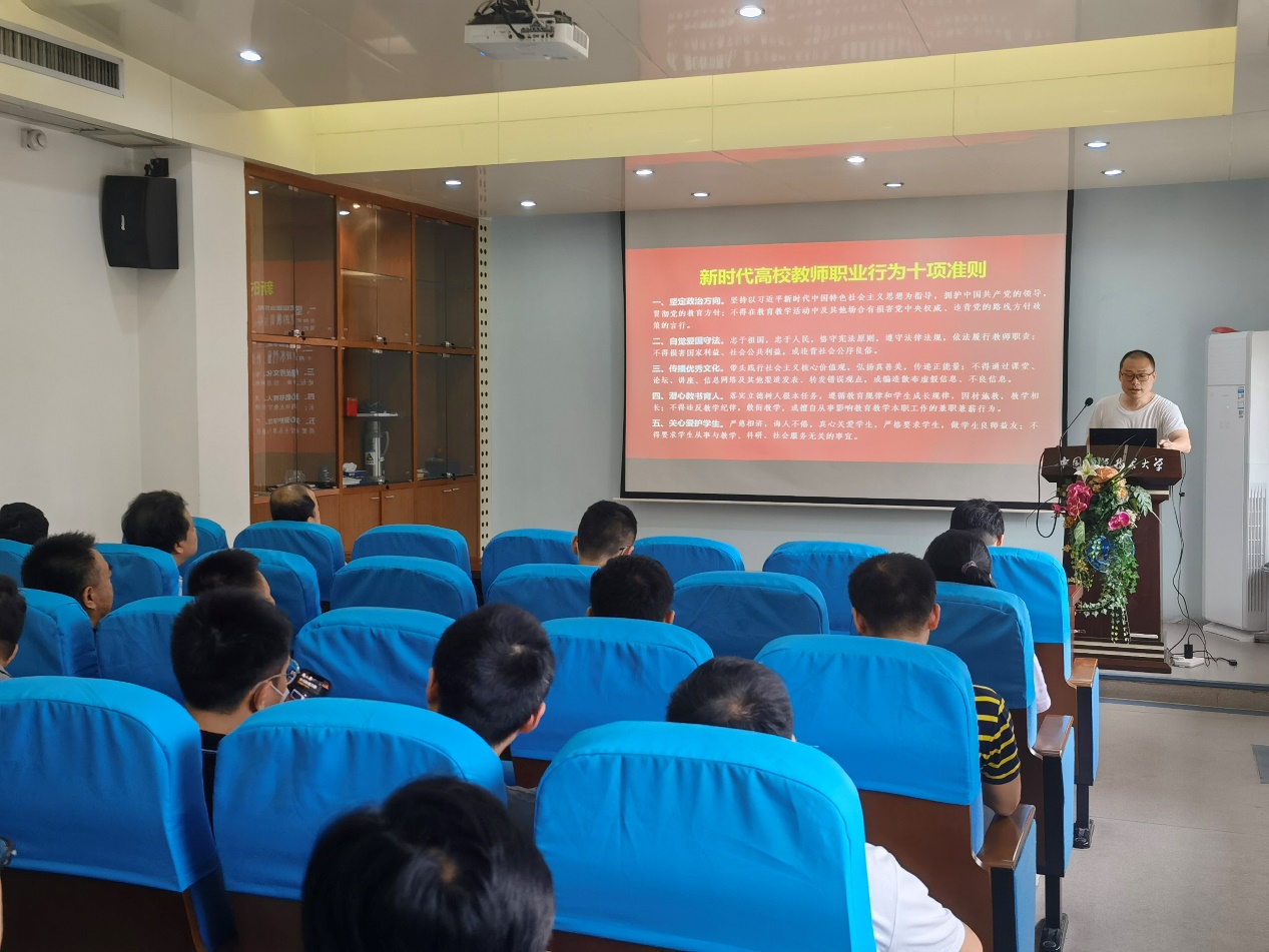 院纪检委员赵凯通报了某些师德师风失范和违规违纪问题的案例,提醒大家要从这些案例中汲取教训,引以为戒, 深刻理解落实《十项准则》要求,内化于心,外化于行,加强自身建设,造就高素质教师队伍,奋力推动各方面工作高质量发展,以优异成绩庆祝中国共产党建党100周年。