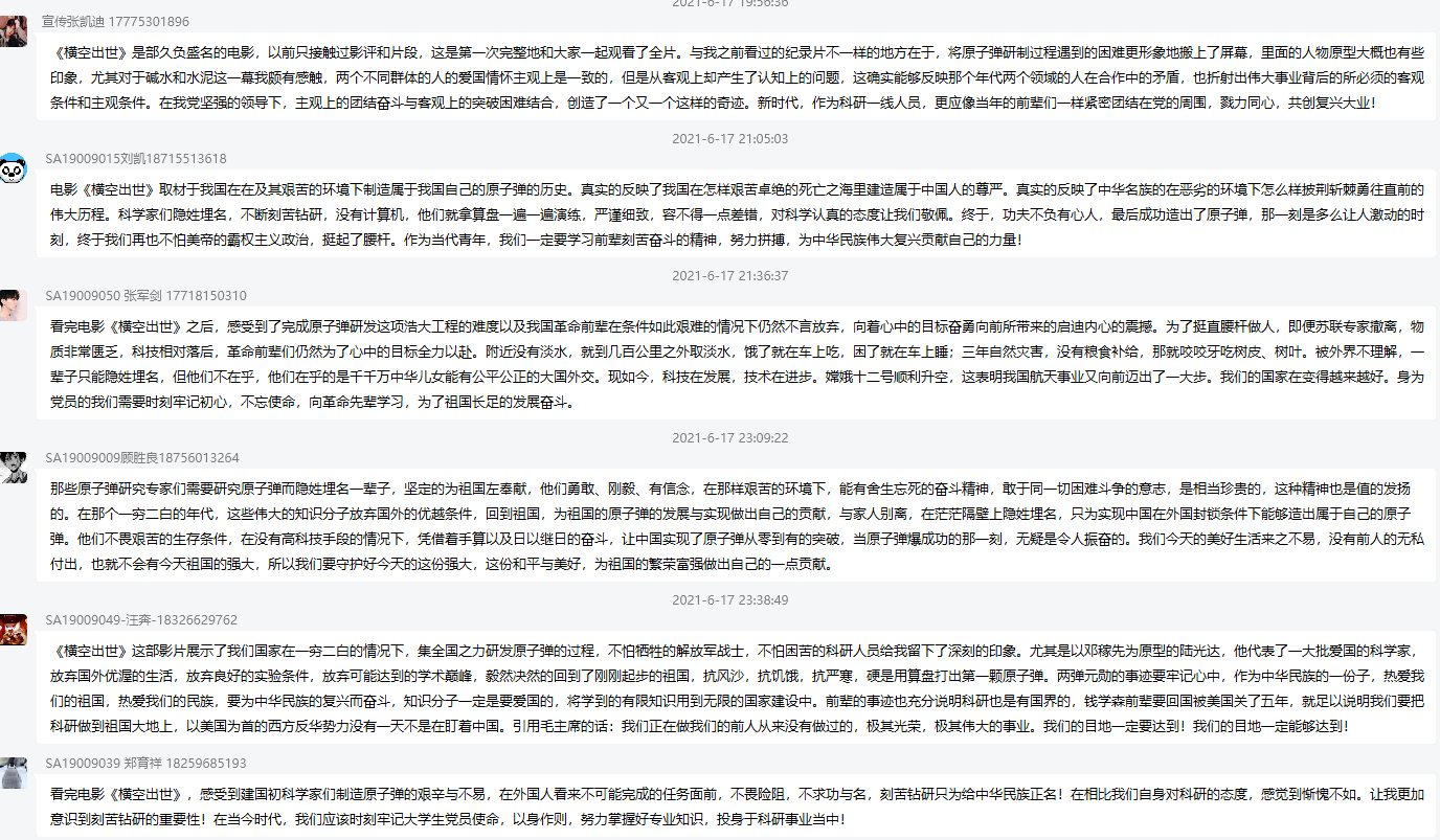 党支书周翔同志这样写道:“作为研究生党员,我们应当学习并发扬老一辈科学家的拼搏精神,努力学习,踏踏实实地搞研究,争取为国家突破关键性技术贡献自己的一份力量。同时,我们应当利用闲暇时间,多去认真地学习党史党章,从历史中汲取力量,学习体会老一辈革命者的伟大精神,并结合自身实际,切实地去开展一些有利于党和人民的工作,不忘初心,牢记使命,为中华民族伟大复兴的中国梦不懈奋斗。”更多的同志在线上分享了自己的感悟并且表示自己将会更加努力学习和科研,学习党章党史,传承弘扬老一辈科学家们无私奉献的精神,不忘初心,牢记使命。学得文武艺,报效全中国。