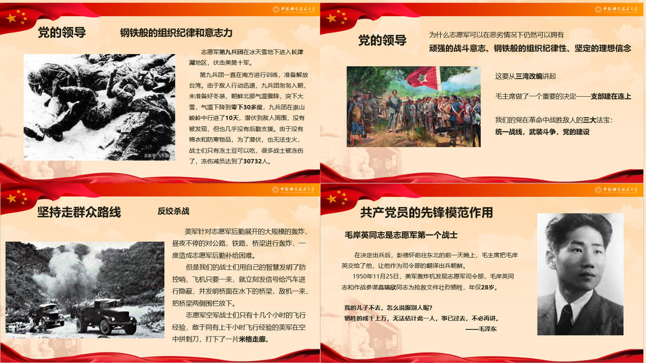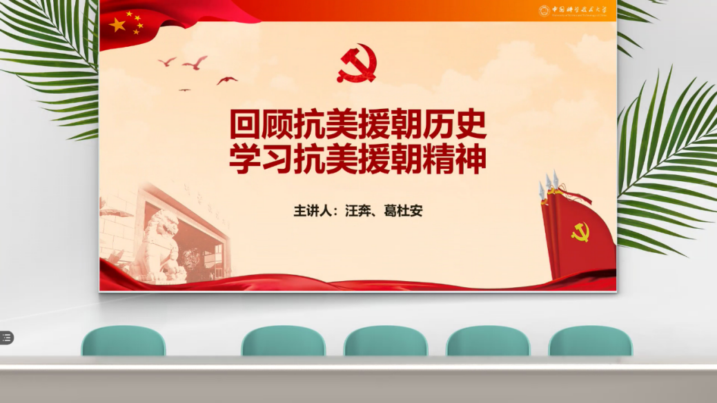 为进一步弘扬爱国主义精神,增强新时代青年党员的责任感与使命感,巩固“不忘初心、牢记使命”的主题教育成果,深化“四史”学习教育,中国科大工程科学学院精密机械与精密仪器系2019级硕士生支部于8月25日在线上开展了“回顾抗美援朝历史,学习抗美援朝精神” 主题党日活动。活动由支委会组织,汪奔、葛杜安同志共同主持。全体支部党员参加了此次活动。