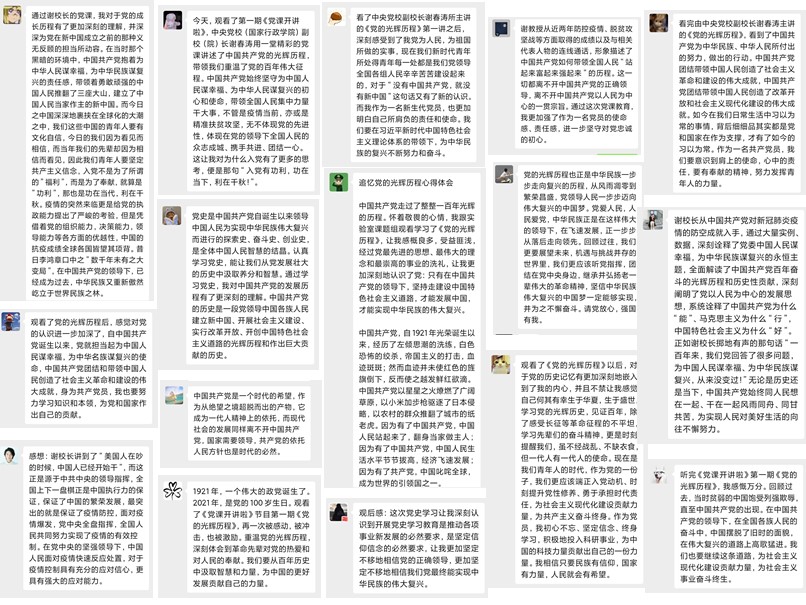 大家都在谢春涛校长的党课中受益匪浅,每个人都在党最先进的思想、最伟大的理念和最崇高的事业的洗礼中更加深刻地认识了党,也更加深刻地学习了习近平总书记在庆祝中国共产党成立100周年大会上的重要讲话精神。观看结束后大家都发表了一些《党的光辉历程》的观后感。
