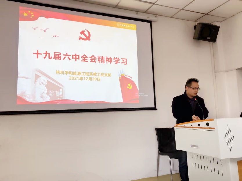 12月29日下午,热科学和能源工程系教工党支部在力学一楼504召开党员大会,深入学习党章与党的十九届六中全会精神。教工党支部书记、系执行主任程文龙主持会议。