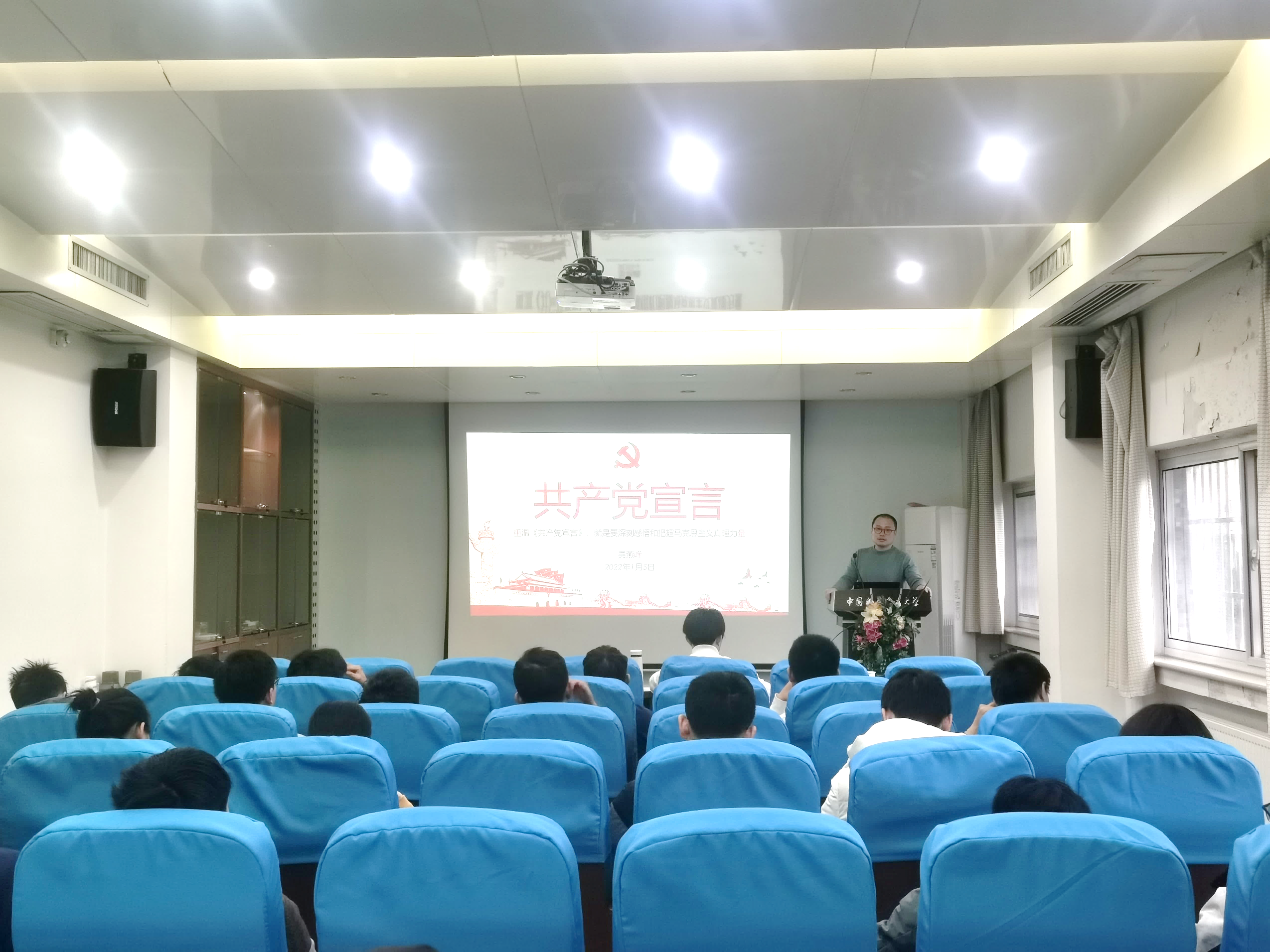 接着,近代力学系党总支部书记吴燕峰老师以《重温<共产党宣言>、深刻感悟和把握马克思主义真理力量》为题作了主题党课。吴燕峰老师以“一个幽灵,共产主义的幽灵,在欧洲大陆徘徊。”为引,从《共产党宣言》产生的历史背景、内容结构和基本原理、理论和实践意义等方面对 《宣言》进行了系统全面的解读。他指出,《宣言》经受住了历史的考验,是中国共产党人的信仰之源;为新时代中国的实践和思想指明了方向,为中国特色社会主义道路注入新的内涵。 《宣言》言辞优美,论辩有力,已被翻译成200多种语言,使共产主义的精深道理能够为广大无产阶级所接受。通过聆听辅导讲座,加深了博士生党员对《共产党宣言》思想内涵、历史影响和当代价值的理解。