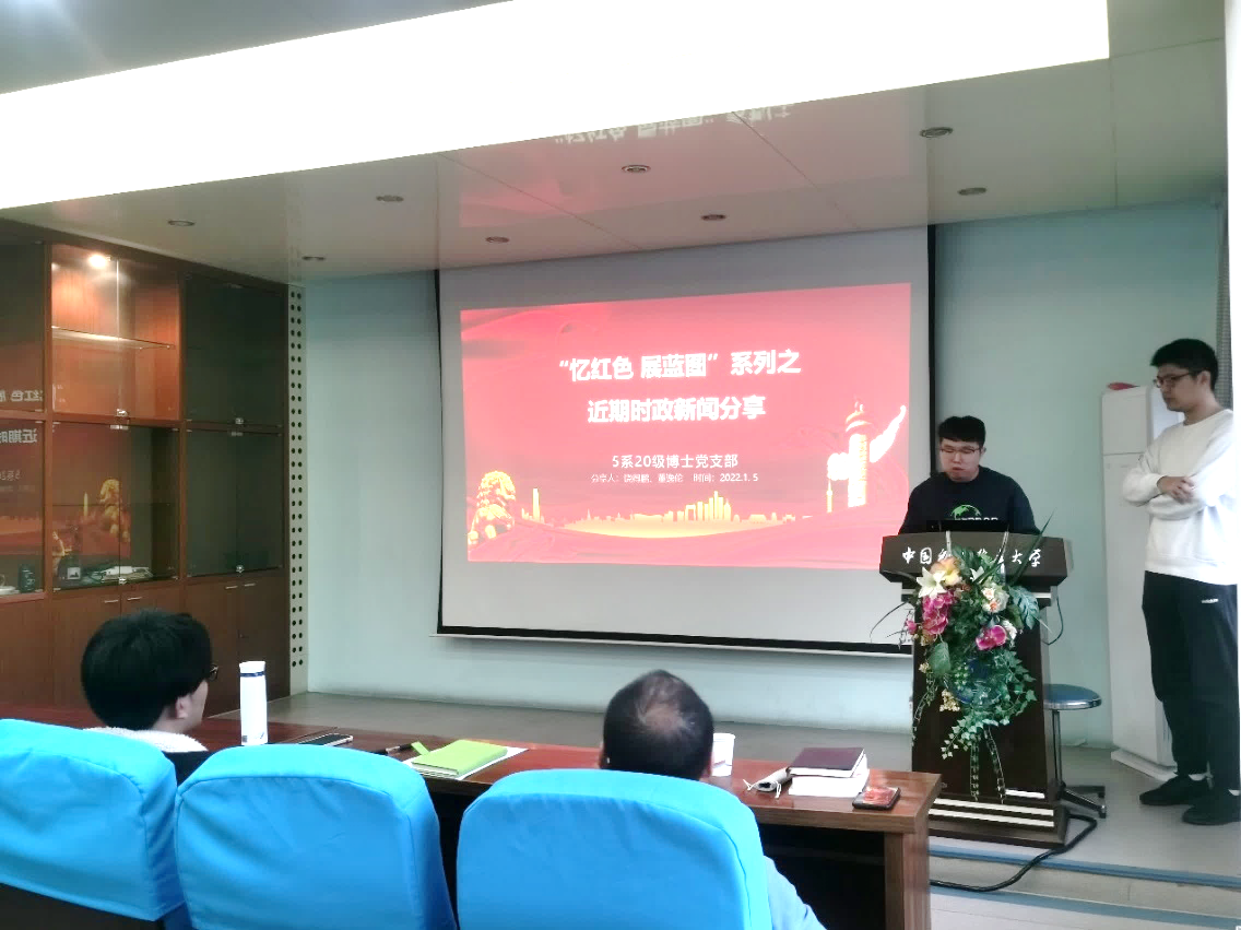 会议伊始,第四党小组的饶得鹏和董逸伦带领大家学习了国际、国内、省内和科技/高校方面近期的时政热点新闻。国际新闻聚焦于全球疫情,截止2022年1月5日,全球累计新冠病毒死亡病例数超过500万。欧洲国家正直面奥密克戎毒株带来的冲击,奥密克戎变种病毒在全球大规模扩散已成定局。只有全球各国齐心协力才能取得疫情防控的全面胜利;国内新闻部分主要解读了习近平总书记发表的二〇二二新年贺词、中央经济工作会议和中央农村工作会议精神。省内新闻部分主要介绍了芜黄高速正式通车,标志着“我为群众办实事”省级重点民生项目(第一批)“县县通高速”攻坚行动圆满完成;科技/高校新闻方面则关注了神舟十三号航天员乘组的出舱活动。11月8日1时16分,经过约6.5小时的出舱活动,神舟十三号航天员乘组密切协同,圆满完成出舱活动期间全部既定任务。