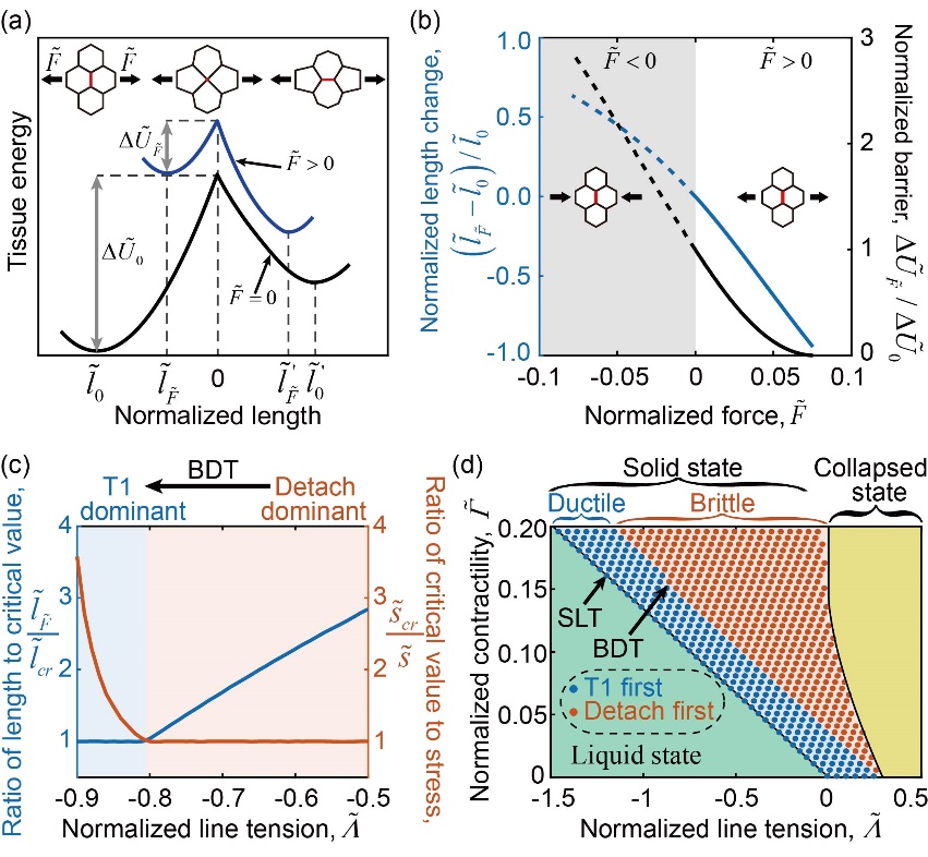 最后,该团队通过一个简化的四细胞模型,进一步证明了这种脆韧转变是由细胞间重排和细胞间脱粘的竞争引起的。该项工作为研究活体组织的断裂破坏提供了一个理论框架,并可能对许多其它生物学过程,例如伤口愈合和组织形貌发生,具有重要意义。