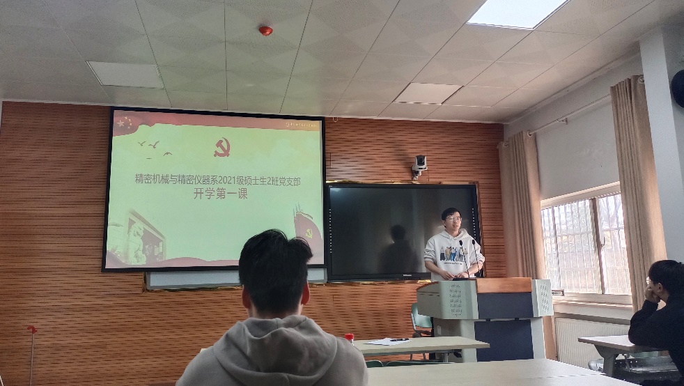 新学期伊始,为喜迎2022全国两会的召开,2022年3月2日精密机械与精密仪器系2021级硕士生第二党支部在力学二楼215教室召开“开学第一课”主题党日活动。本次活动由党支部常务副书记李松霖主持,副书记邹文豪记录,全体党员及入党积极分子参与。