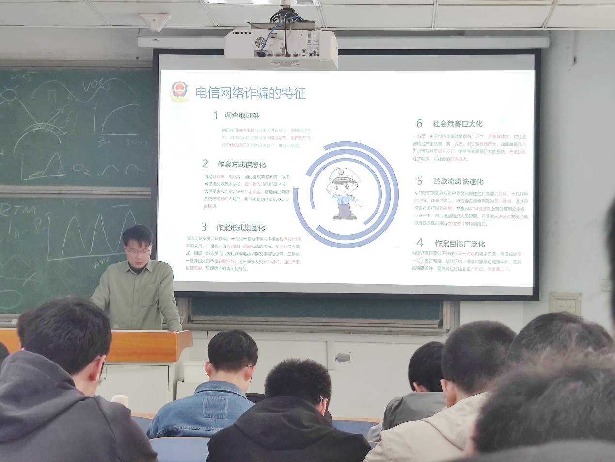 本次班会由安全委员陶健召开,通过PPT的形式,从“什么是网络诈骗?”、“电信诈骗受害群体特征”、“电信诈骗常见形式”、“如何防范电信网络诈骗”等多个方面,由浅入深、由点及面,通过案例分析,向同学们深度剖析包括“奖学金诈骗”、“裸聊诈骗”、“网购炸骗”等电信网络诈骗的常见骗术。最后,针对不同类型的诈骗方式,陶健向同学们发放防诈骗指南:“不明来电别轻信,不明链接莫点击,汇款转账要核实,个人两卡不倒卖”。
