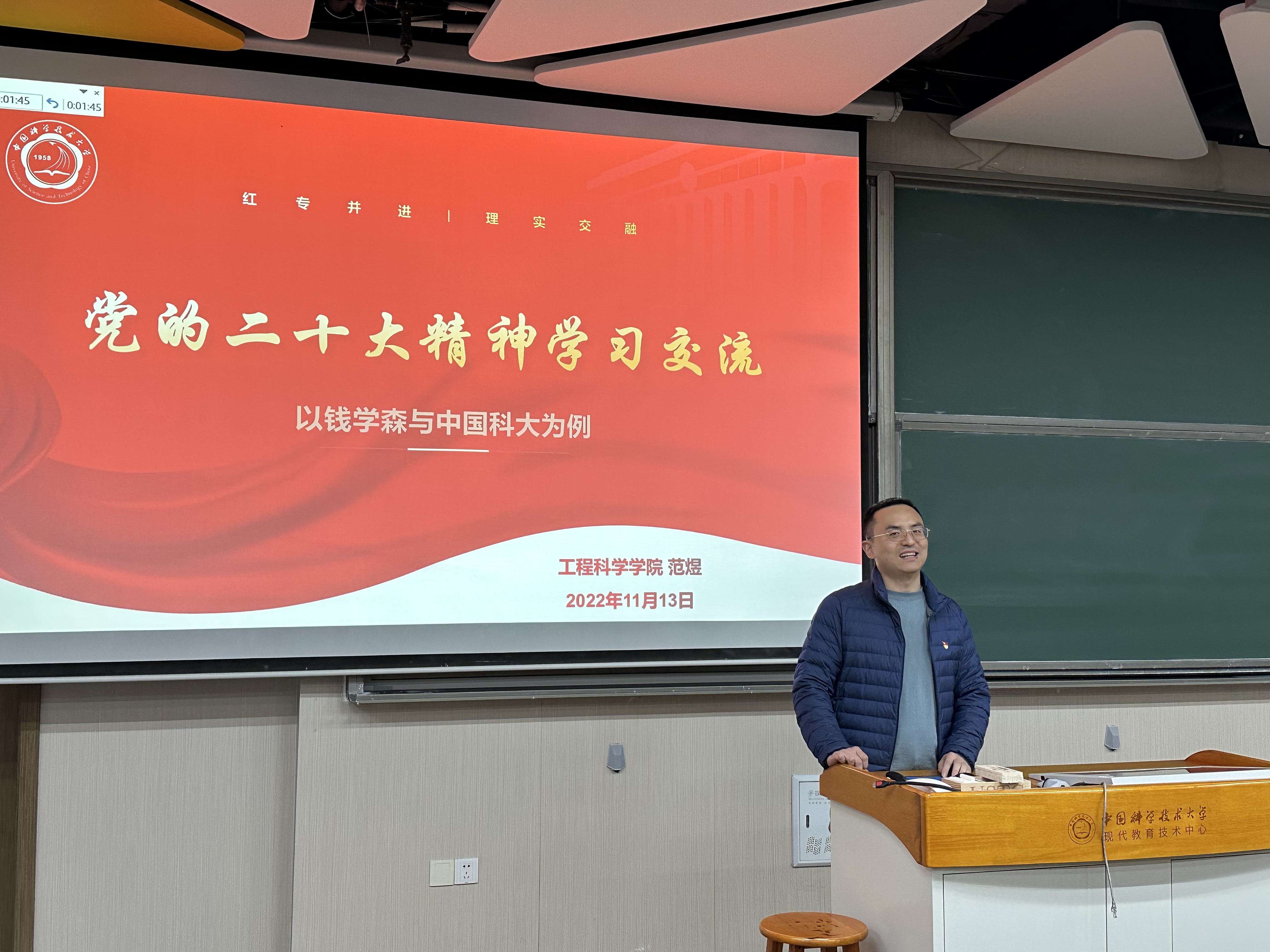 范煜为工程科学学院近代力学系本硕博毕业生,本科期间担任校学生会主席并担任全国学联驻会执行主席在团中央工作一年,研究生期间两次获得国家奖学金,并荣获中国科学院优秀共产党员、安徽省十佳大学生等称号,目前正积极开展新工科人才培养特别是钱学森教育思想的教学研究工作。他结合自己学习生涯的经历,以“钱学森与中国科大”为例,与同学们分享了学习党的二十大精神的心得体会。他指出,党的二十大报告中习近平总书记提出“要实施科教兴国战略,强化现代化建设人才支撑”,这是我们党首次将教育、科技、人才三大战略进行统筹部署,这体现了教育、科技、人才是全面建设社会主义现代化国家的基础性、战略性支撑,又强调了三者之间的有机联系,通过协同配合、系统集成,共同塑造发展的新动能新优势。我校创办者之一、力学系首任系主任钱学森先生就是一位对教育、科技、人才三位一体思考的先行者,了解钱老不平凡的人生经历,特别是其教育思想及在中国科大的办学实践,有助于我们更好地理解我们党将科技、教育、人才放在二十大报告第五部分进行统筹部署、集中表达的深刻用意。