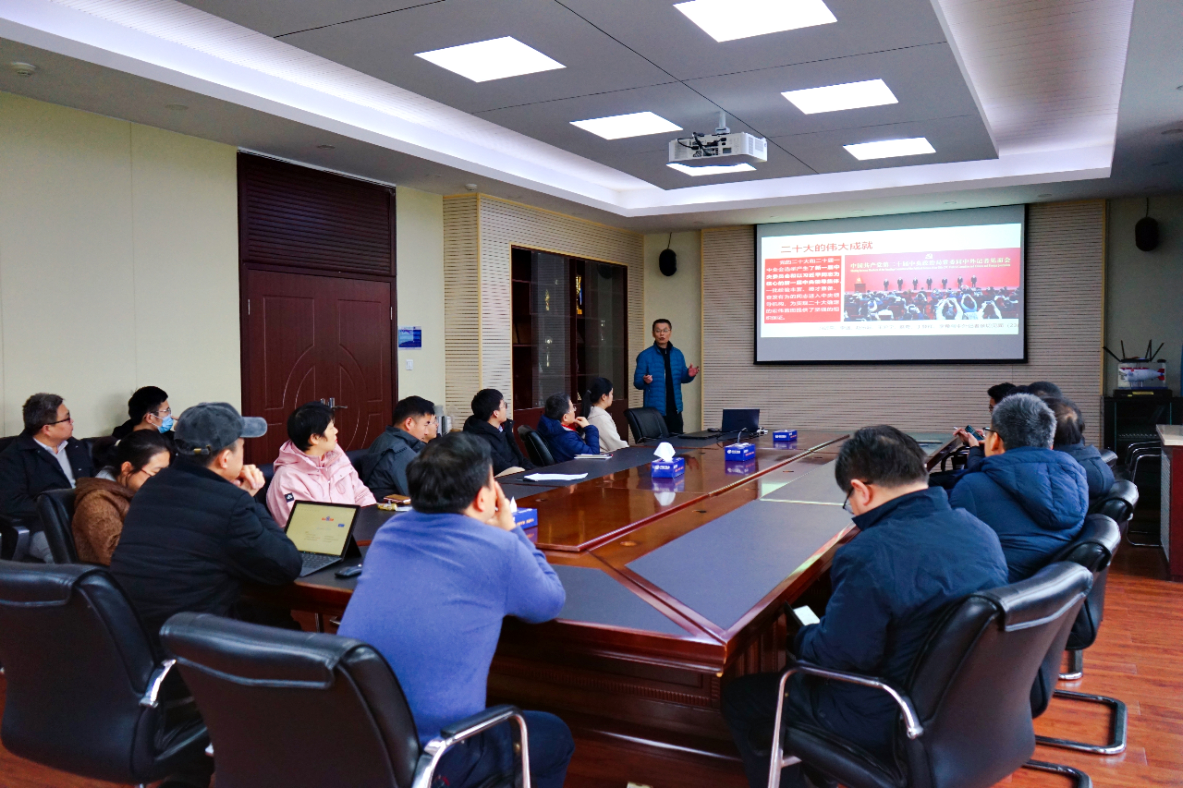 刘明候首先介绍了《中共中央关于认真学习宣传贯彻党的二十大精神的决定》以及我校党委关于学习、宣传和贯彻二十大精神的工作部署。他以“学习、宣传和贯彻党的二十大精神,建功新时代”为题,从新时代伟大成就、党代会制度、关键词学习等方面做了详细论述,结合我国光伏产业和高铁电信等高新技术产业的发展历程、中美选举制度和社保制度的对比、英国大学如何对待言论自由等实例,对党的二十大精神进行了生动系统的讲解。最后,刘明候用习近平总书记带领中共中央政治局常委瞻仰延安革命纪念地时的讲话勉励大家:“二十大制定了当前和今后一个时期党和国家的大政方针,描绘了以中国式现代化全面推进中华民族伟大复兴的宏伟蓝图。让我们踏上新征程,向着新的奋斗目标,出发!”