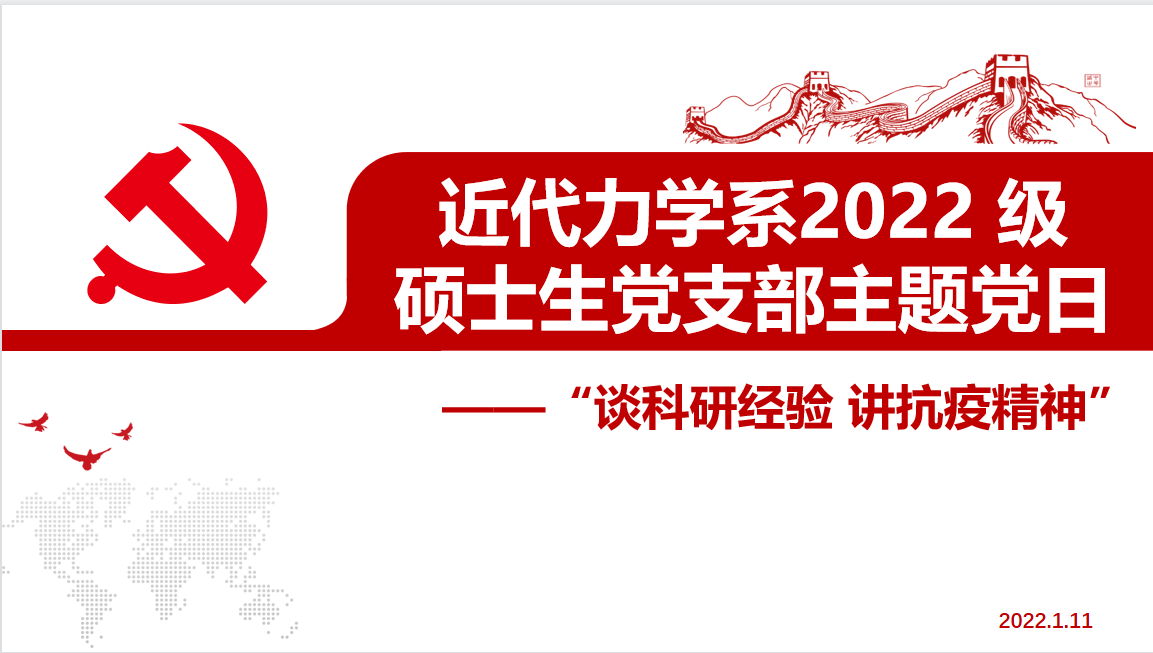 2023年1月11日下午,近代力学系2022级硕士生党支部于线上召开了“谈科研经验 讲抗疫精神”主题党日活动,工程科学学院团委书记王储老师出席会议。会议由党支部书记周睿主持。
