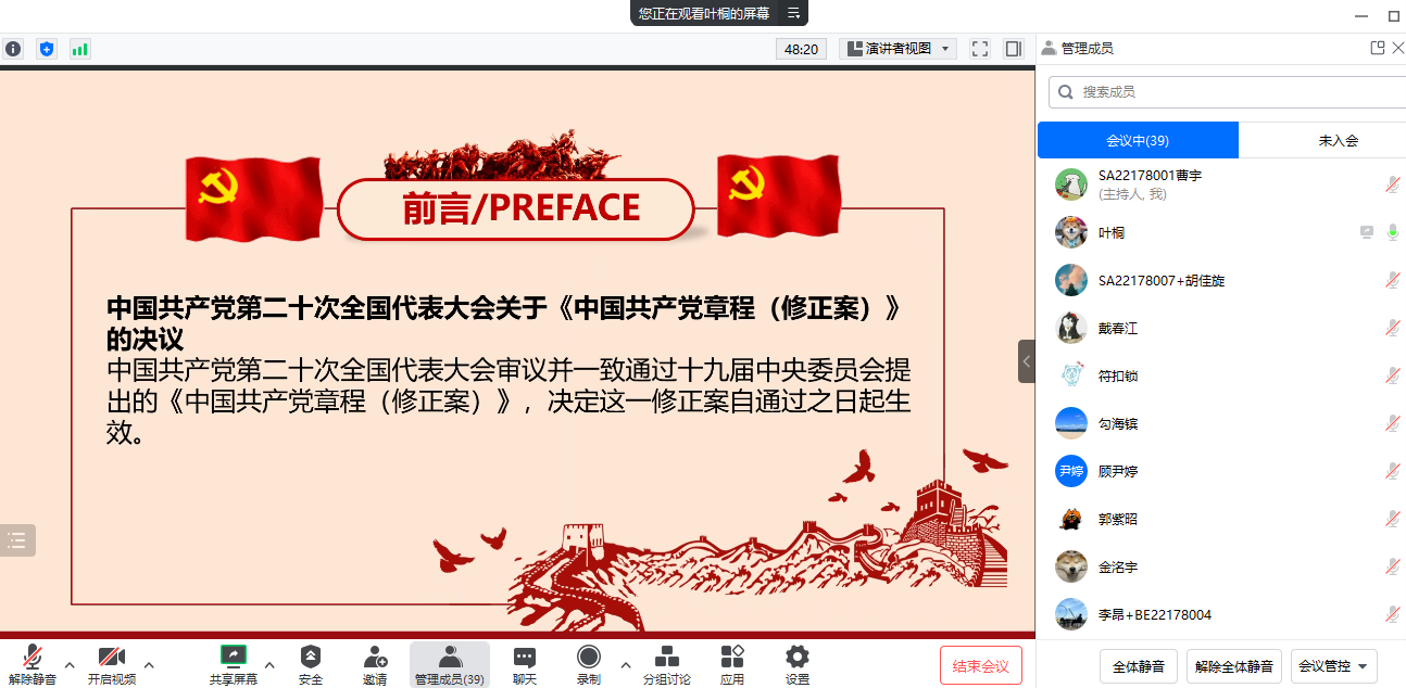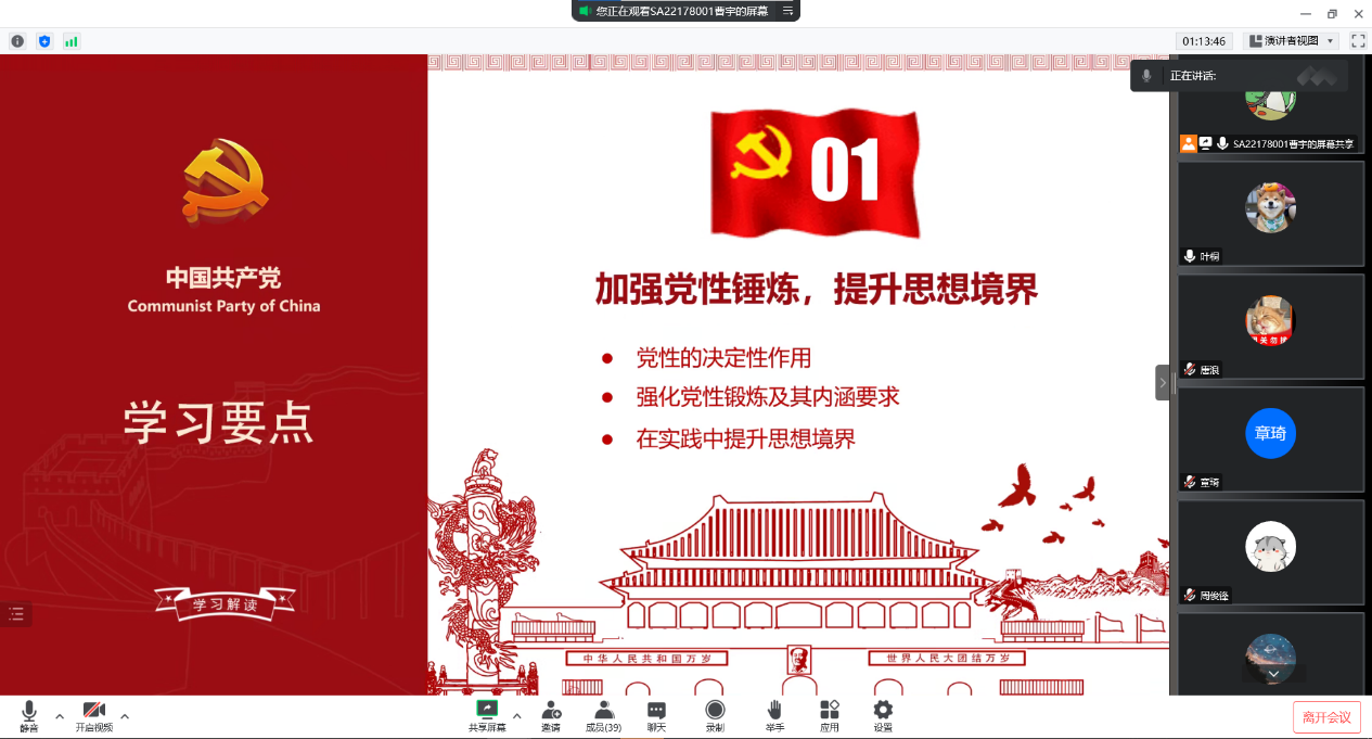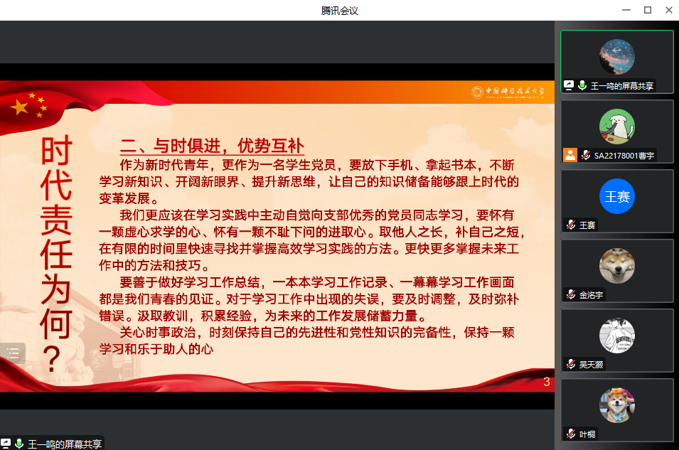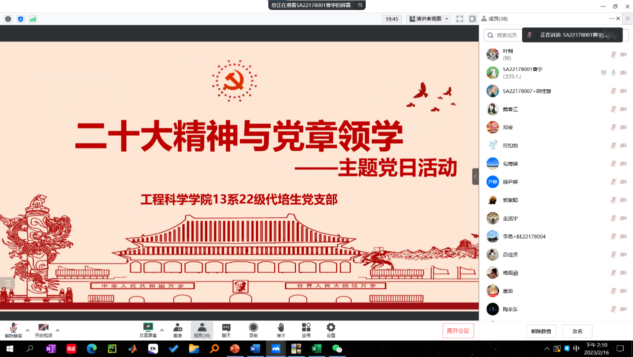 2023年2月16日,热科学和能源工程系2022级代培生党支部线上开展了“二十大精神与党章领学”主题党日活动,支部全体党员与入党积极分子参加,会议由党支部书记曹宇主持。
