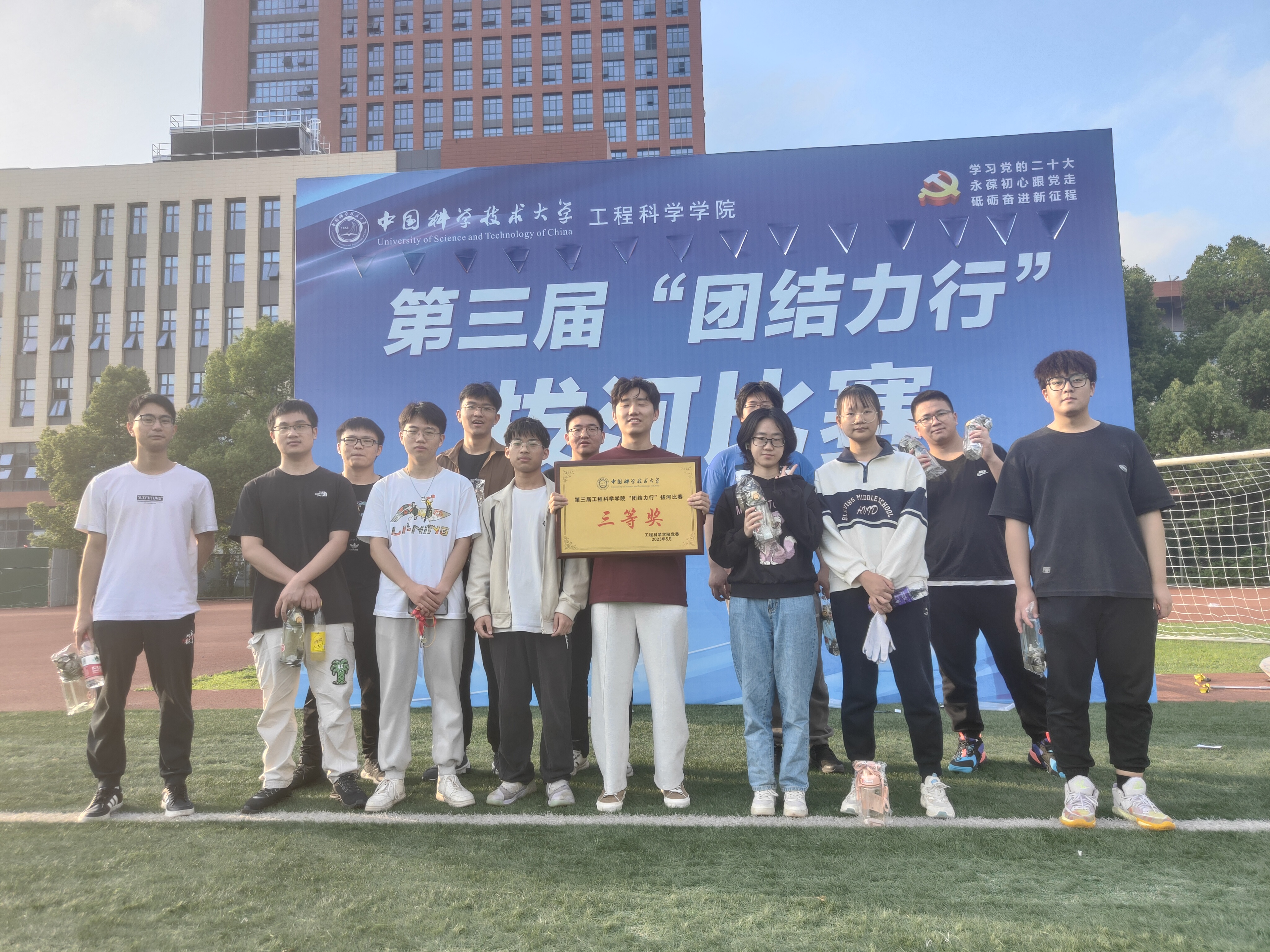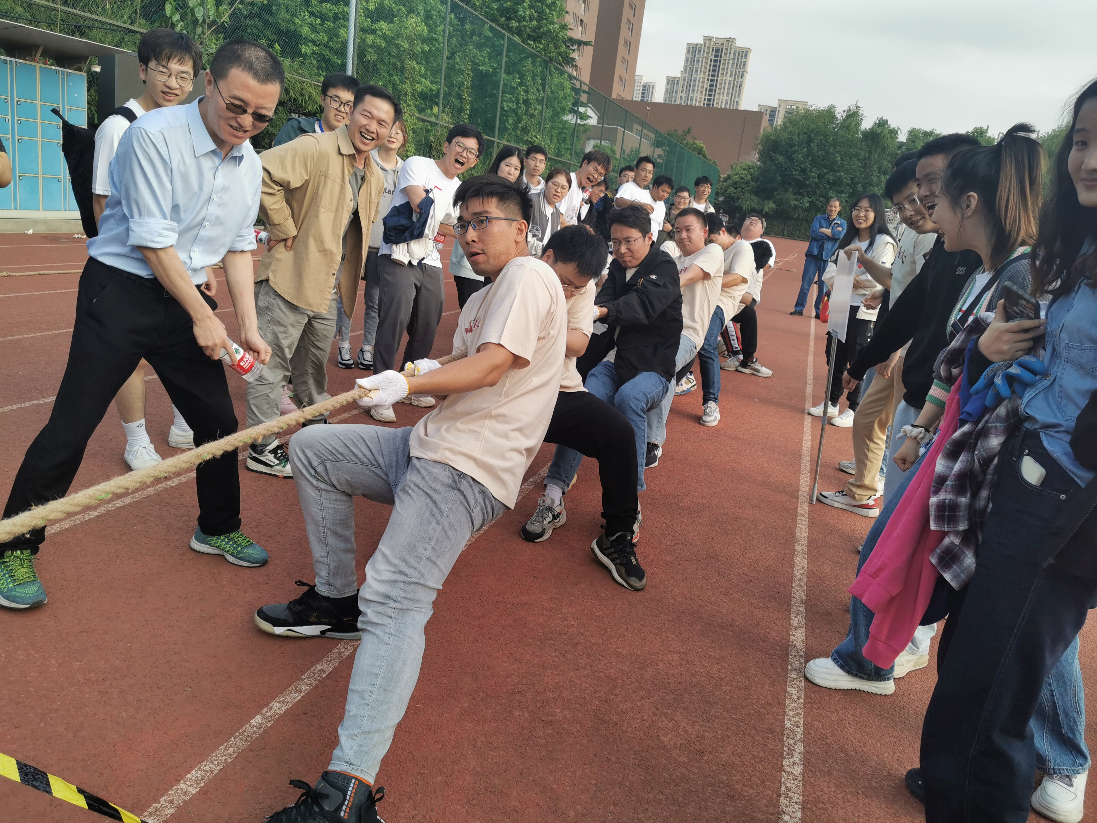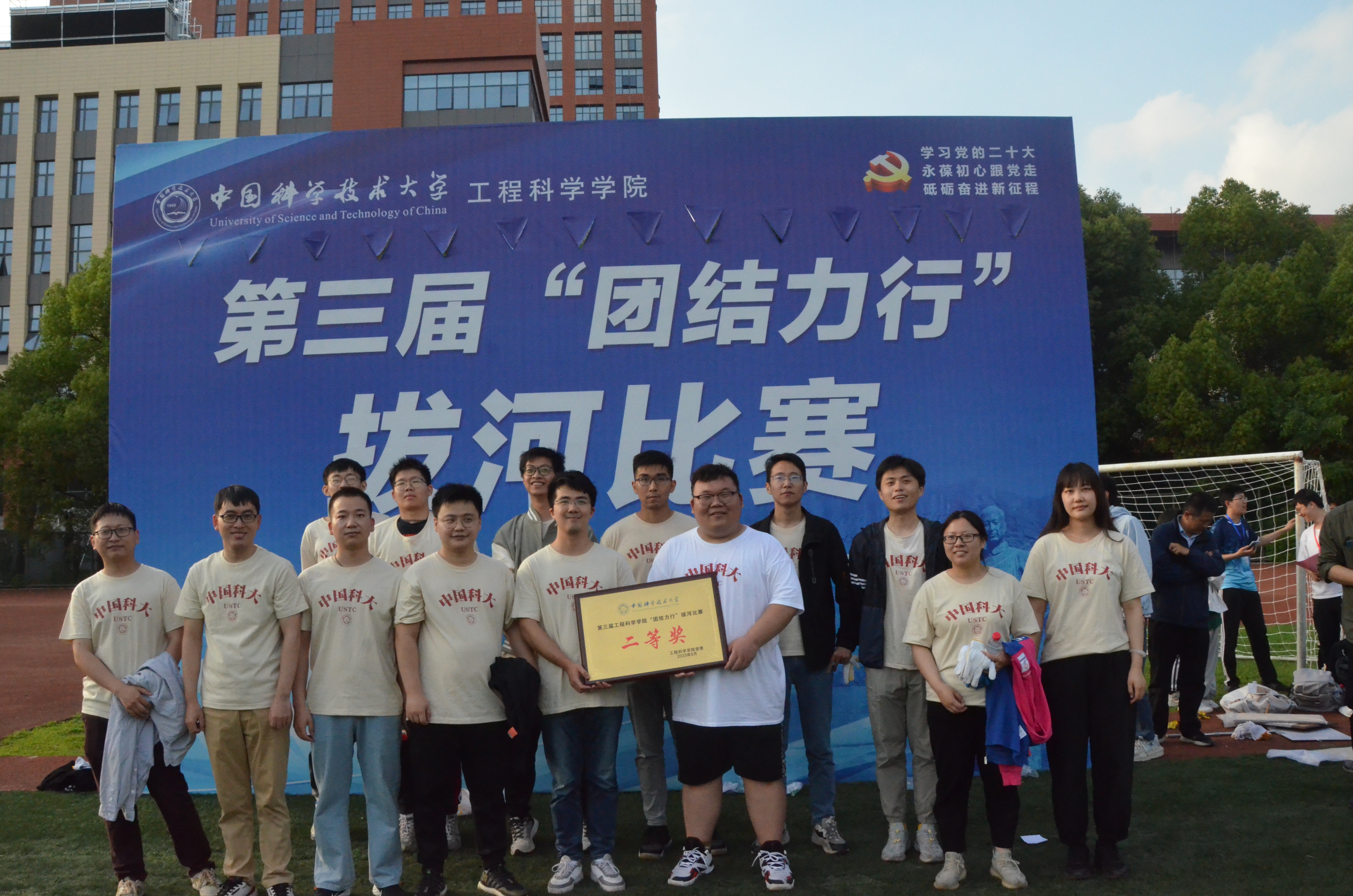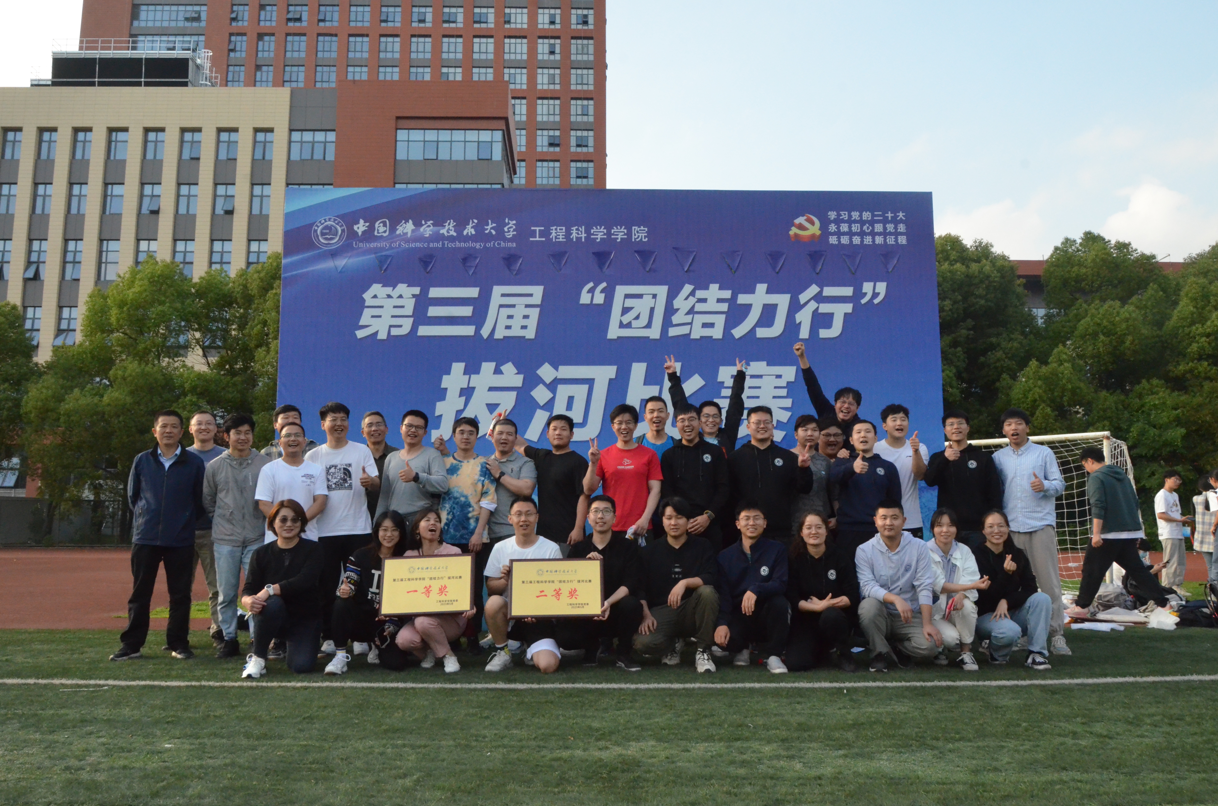 为庆祝党的二十大胜利召开,丰富学习贯彻习近平新时代中国特色社会主义思想主题教育的形式和内容,激发工院人团结、奋进、向上的精神力量,增强学院凝聚力,5月24日下午,工程科学学院“团结力行”拔河比赛在西区大操场顺利开赛。全院28支队伍、共约400余名师生参加了比赛。院党委书记兼副院长刘明侯、党委副书记牟玲到场为运动员们加油助威。