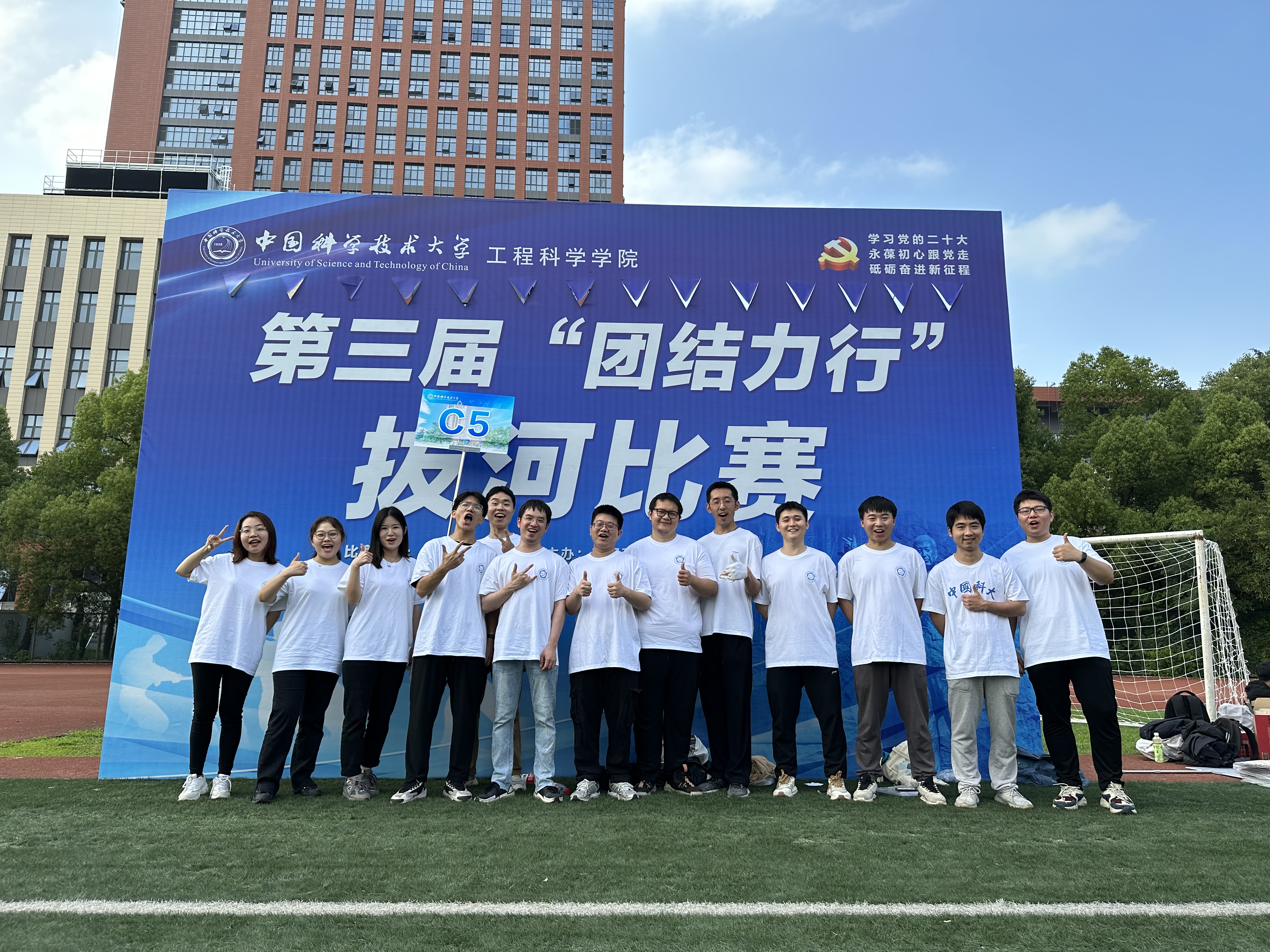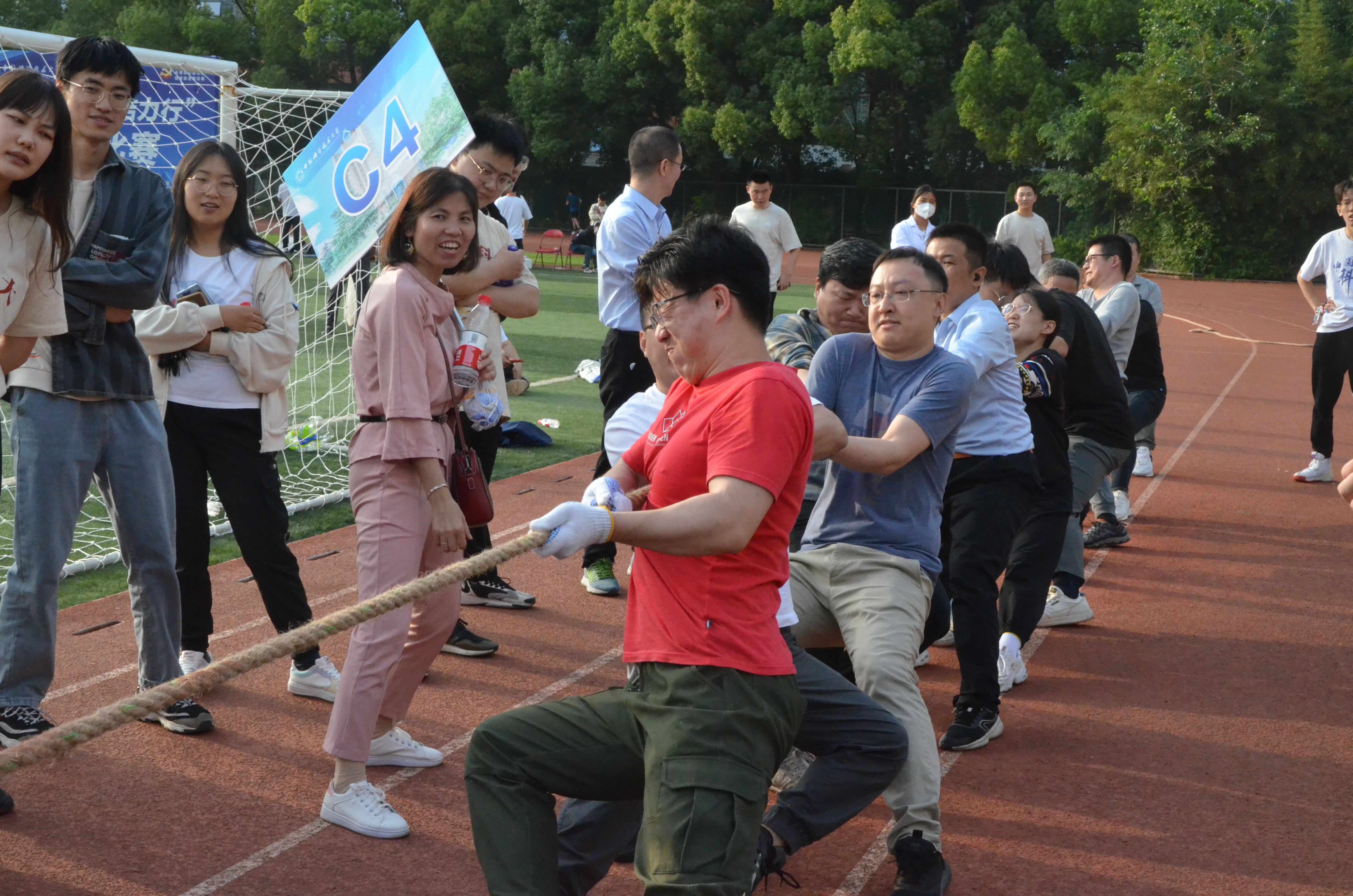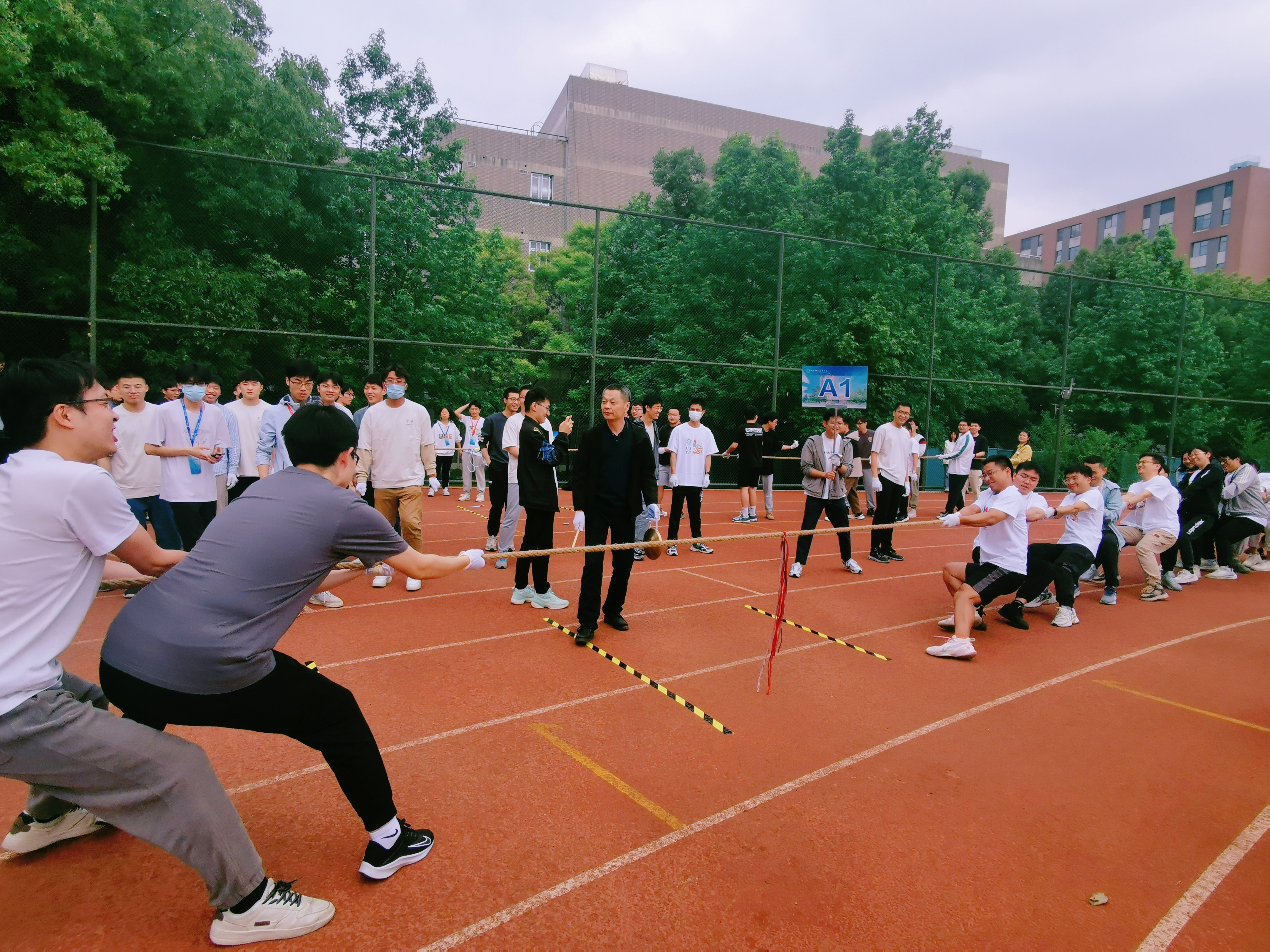 为庆祝党的二十大胜利召开,丰富学习贯彻习近平新时代中国特色社会主义思想主题教育的形式和内容,激发工院人团结、奋进、向上的精神力量,增强学院凝聚力,5月24日下午,工程科学学院“团结力行”拔河比赛在西区大操场顺利开赛。全院28支队伍、共约400余名师生参加了比赛。院党委书记兼副院长刘明侯、党委副书记牟玲到场为运动员们加油助威。