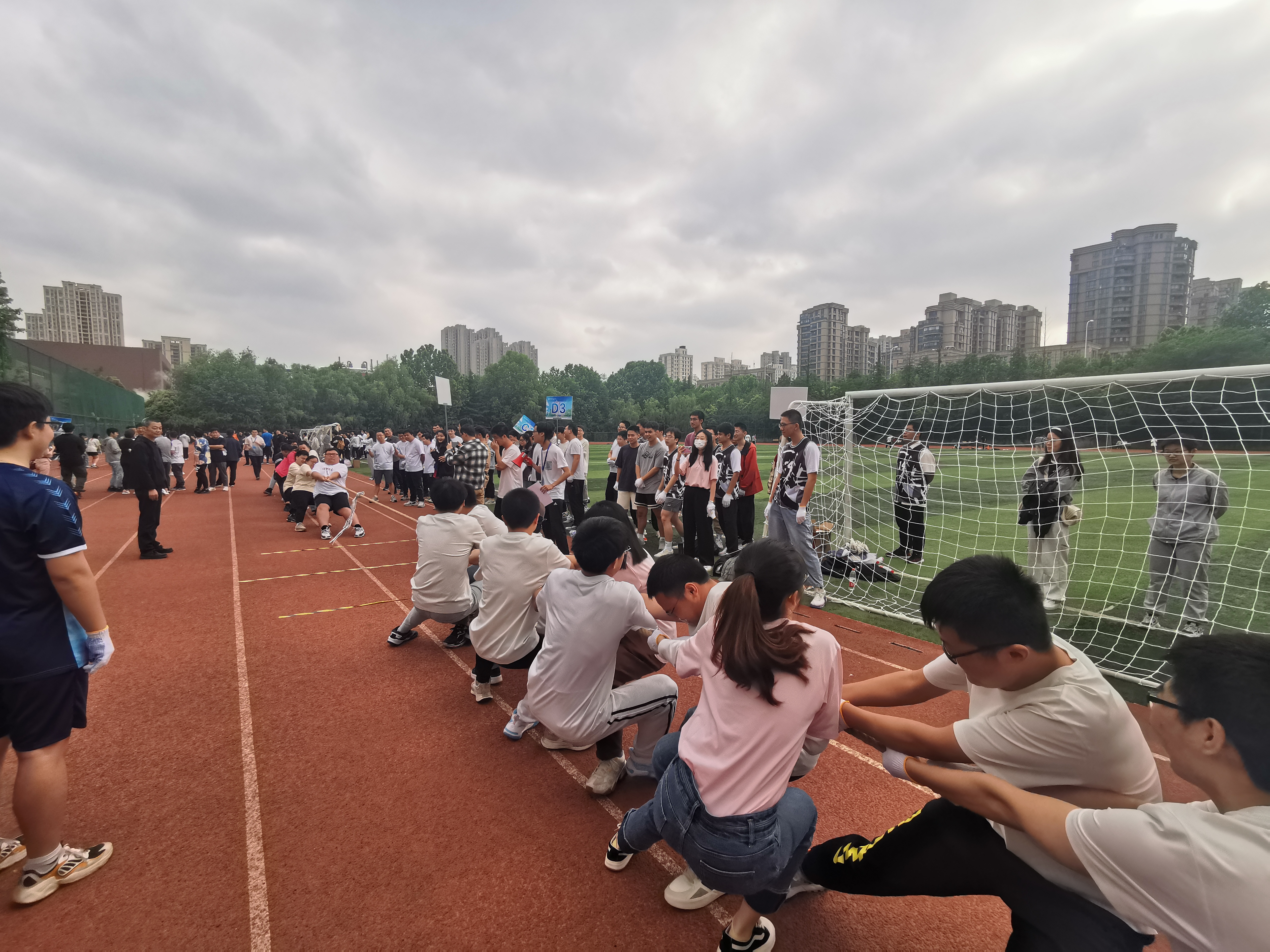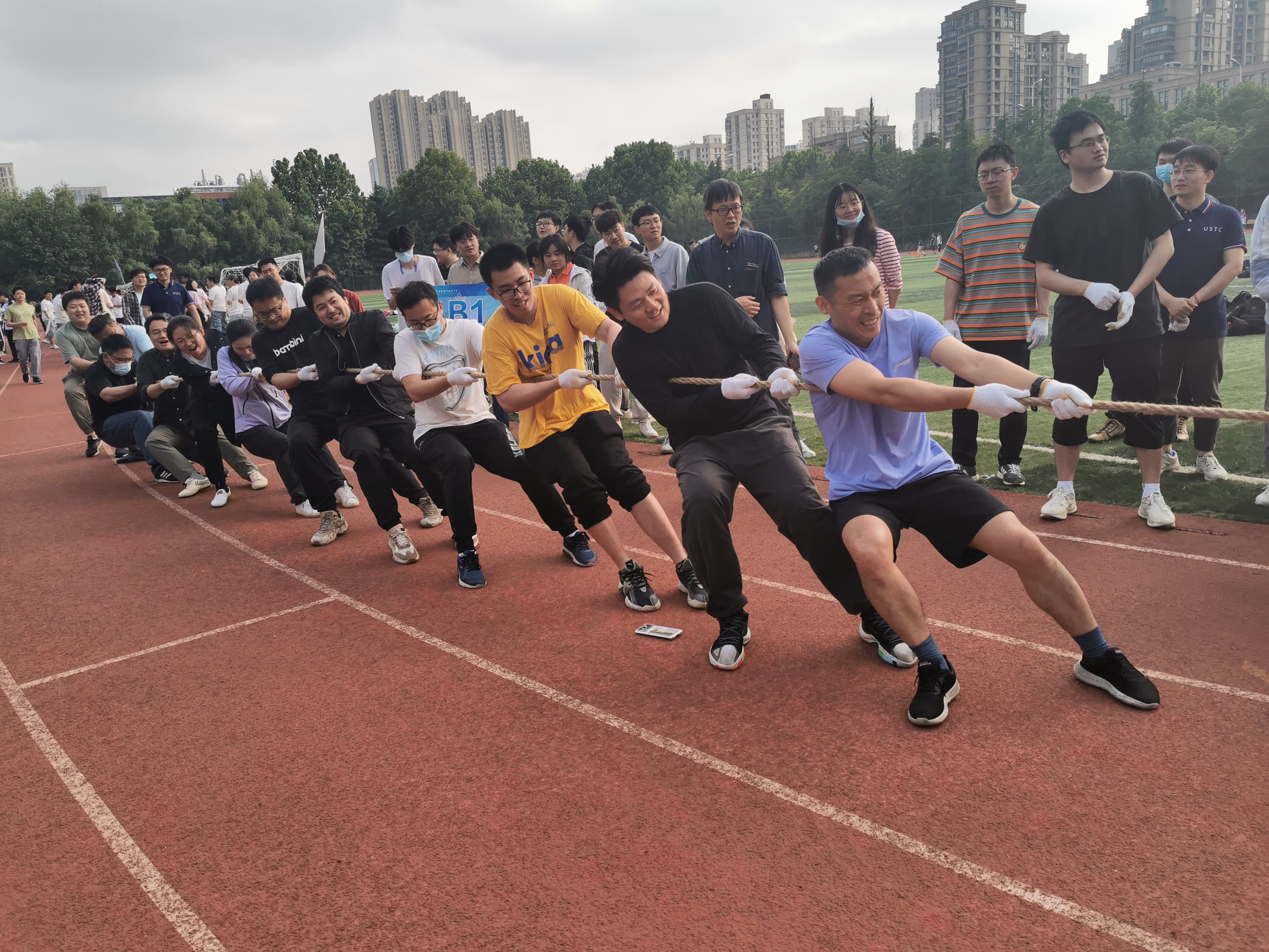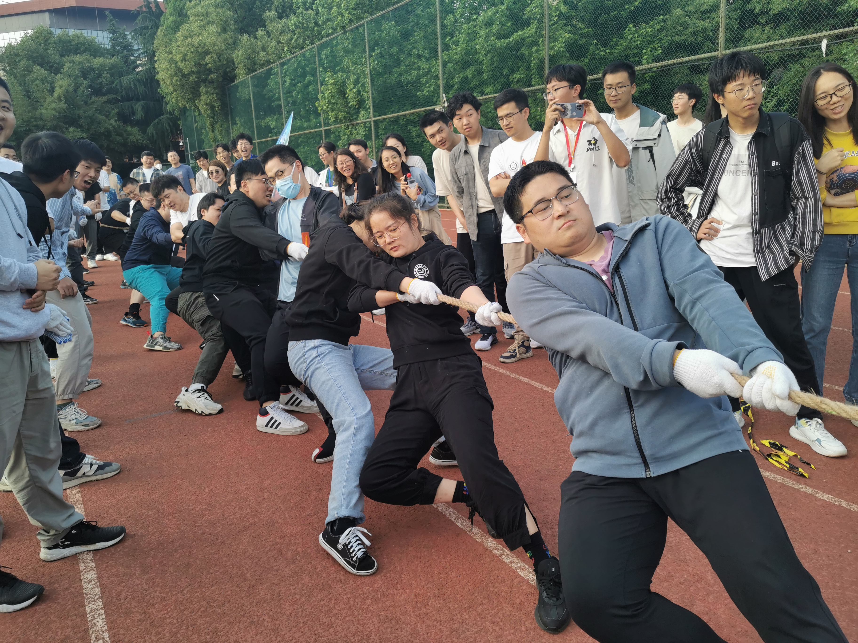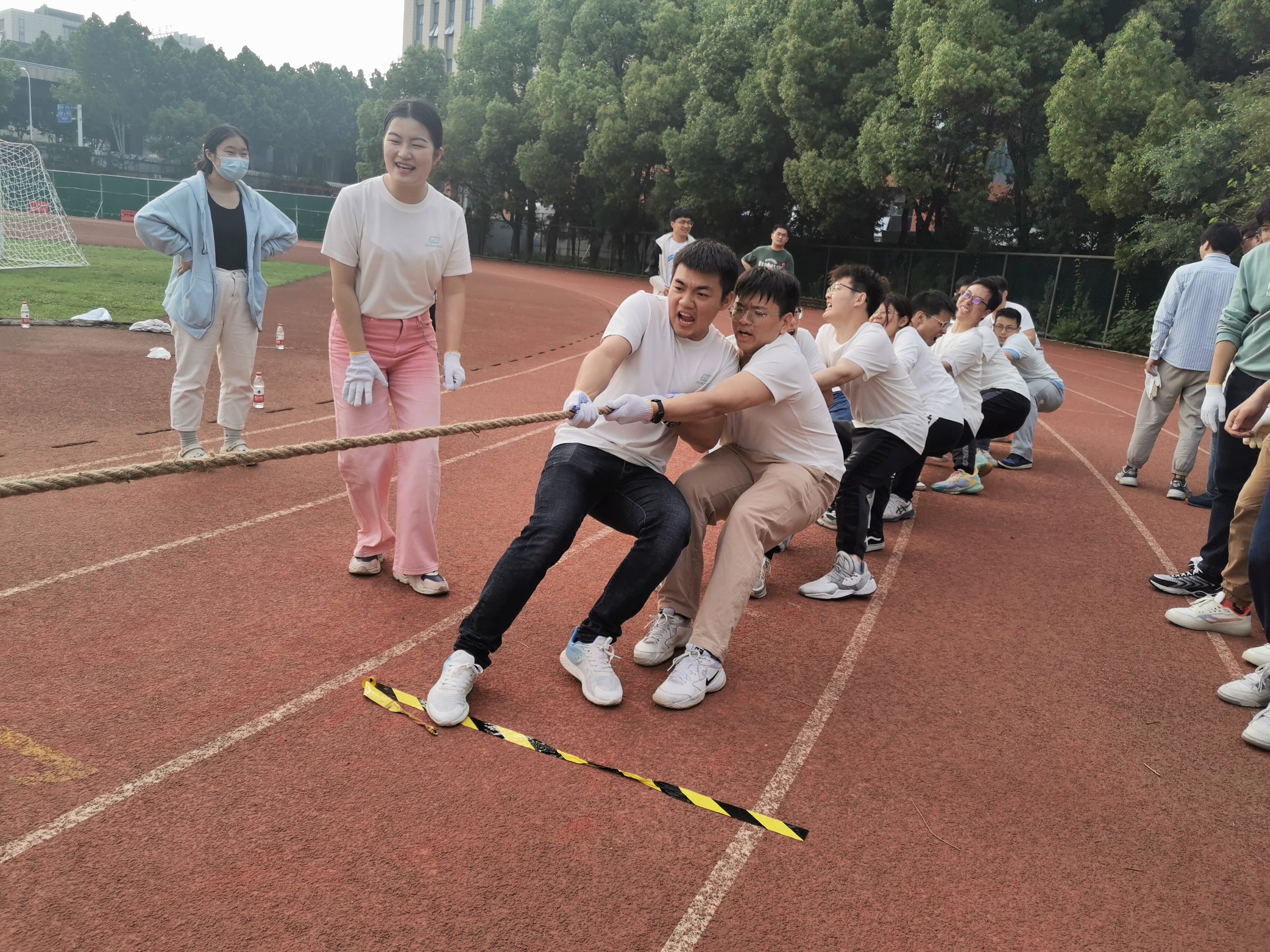 为庆祝党的二十大胜利召开,丰富学习贯彻习近平新时代中国特色社会主义思想主题教育的形式和内容,激发工院人团结、奋进、向上的精神力量,增强学院凝聚力,5月24日下午,工程科学学院“团结力行”拔河比赛在西区大操场顺利开赛。全院28支队伍、共约400余名师生参加了比赛。院党委书记兼副院长刘明侯、党委副书记牟玲到场为运动员们加油助威。