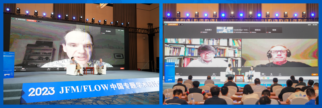 会议期间,与会人员先后与JFM和FLOW期刊的编委们开展了面对面交流对话。中国区副主编吴子牛教授、王连平教授、吕存景教授分别连线C. P. Caulfield教授、Carl Meinhart教授、Shu Takagi教授,并共同对话现场与线上的参会人员,解答了流体力学领域专家学者对两本期刊的发展方向、收录情况、评审流程等方面的关切问题,讨论氛围温馨热烈。