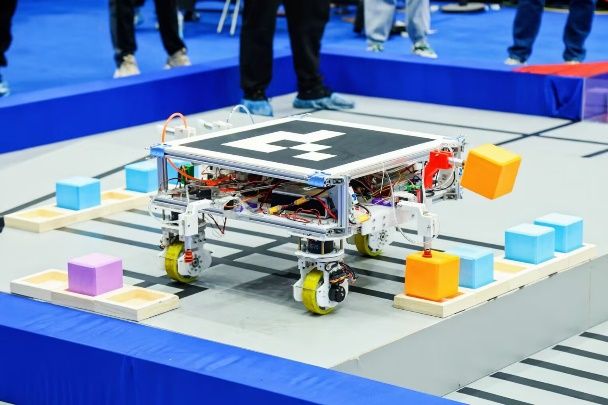 竞技组比赛率先开始。从预赛中杀出重围的队伍开始激烈的决赛比拼。红方和蓝方同时从启动区出发前往矿山采集矿石,再回到启动区将采集到的燃料矿和晶体矿分别放到火箭区相应位置。经过激烈的八进四比赛,“兔兔突击队”“赛博矿工队”“农场主队”“施工队”成功晋级四强。四强争霸赛采用双败赛制,“农场主队”一路过关斩将,最终夺得冠军;“兔兔突击队”紧随其后,摘得亚军;“赛博矿工队”“施工队”共同获得季军。