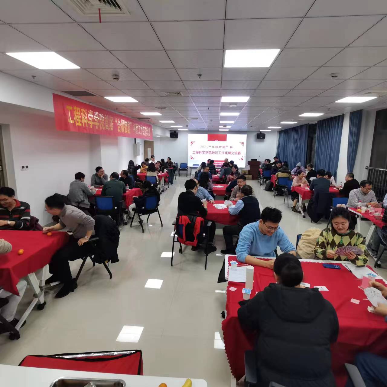为喜迎2024元旦佳节,加强教职工之间沟通交流与团结合作,2023年12月29日晚,工程科学学院成功举办“合锻智能”杯教职工扑克牌交流赛,近60名教职工欢聚一堂,兴致勃勃地参加了比赛。